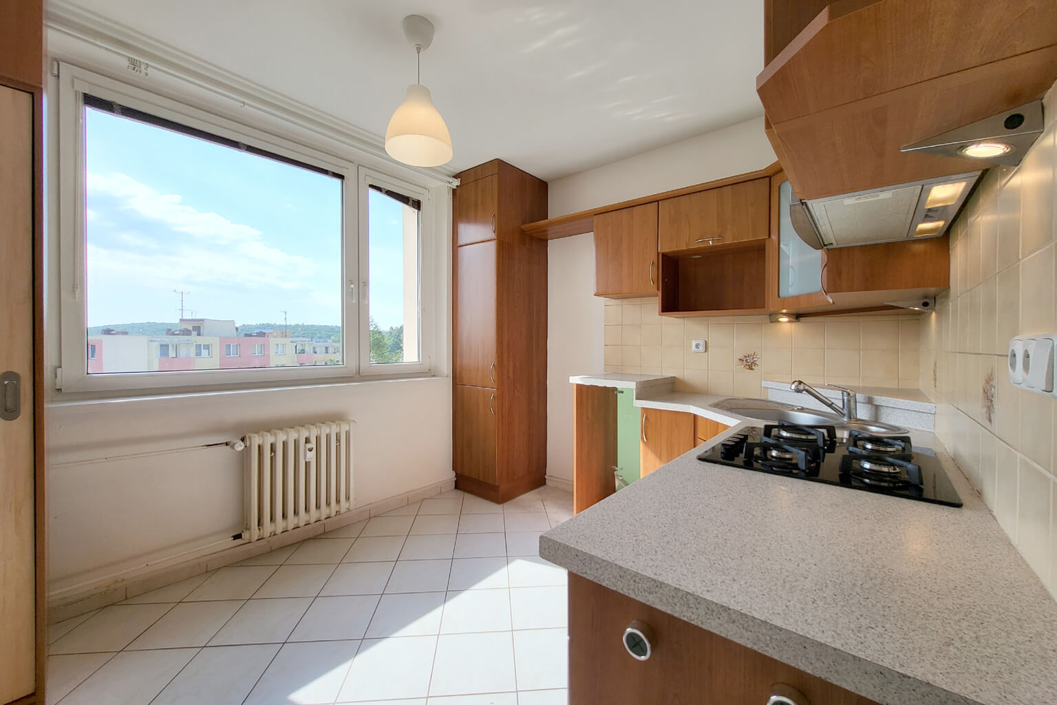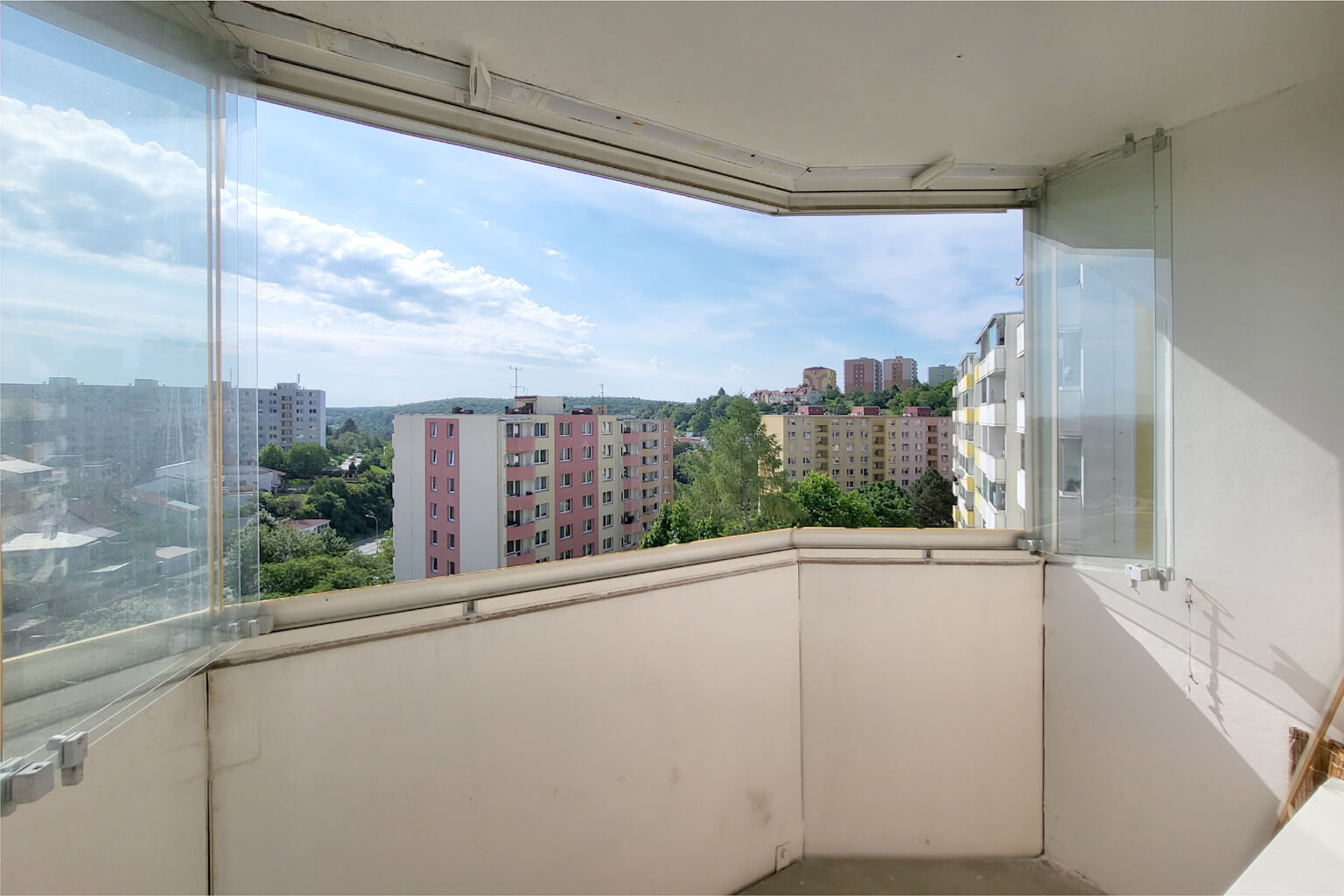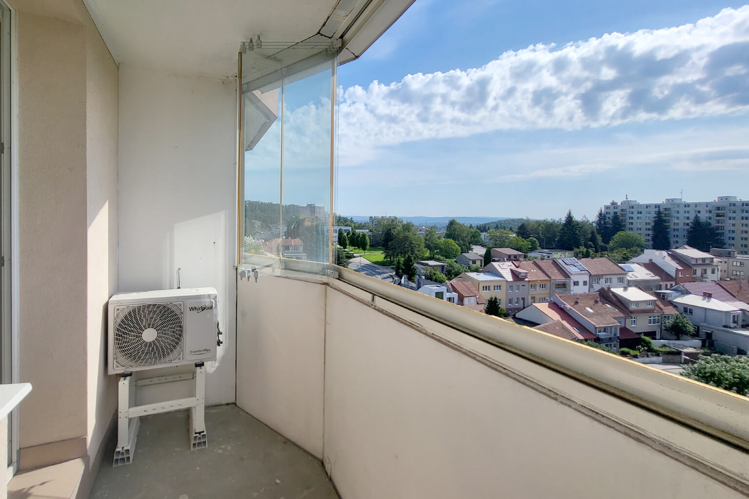 Moderní kuchyně je dopoledne zalitá sluncem a odpoledne tu pak máte příjemný stín. Lodžie je zvětšená a zasklená. V obývacím pokoji je – pro všechny případy – instalována klimatizace. Koupelna je také po rekonstrukci a užívat můžete i další výhody domu – vlastní sklep nebo společnou kolárnu a kočárkárnu.