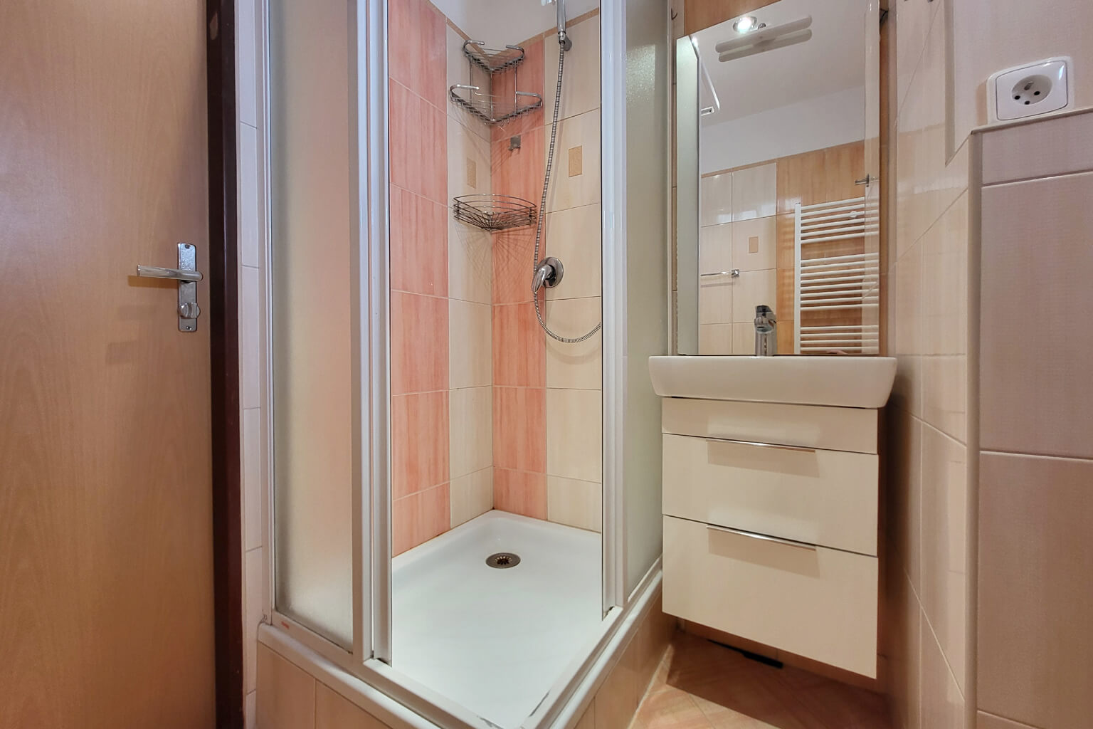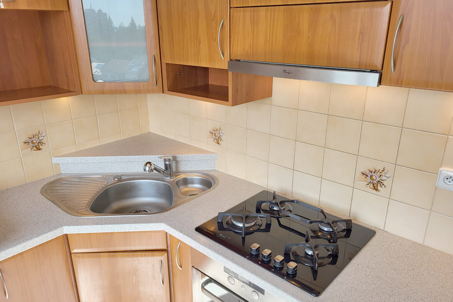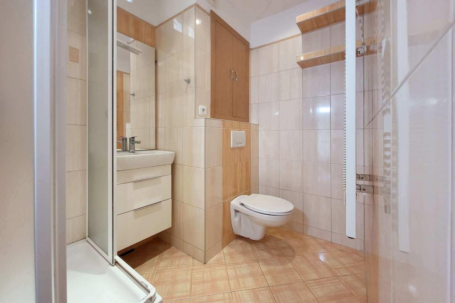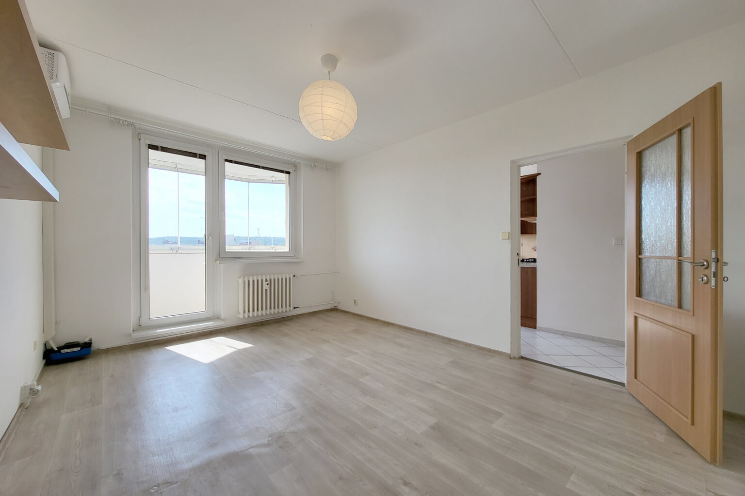 Moderní kuchyně je dopoledne zalitá sluncem a odpoledne tu pak máte příjemný stín. Lodžie je zvětšená a zasklená. V obývacím pokoji je – pro všechny případy – instalována klimatizace. Koupelna je také po rekonstrukci a užívat můžete i další výhody domu – vlastní sklep nebo společnou kolárnu a kočárkárnu.