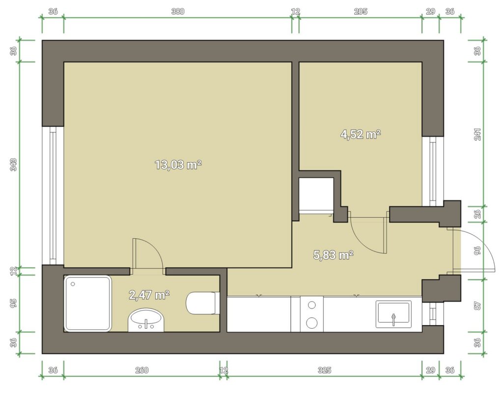 K dispozici budete mít obývací pokoj s kuchyňskou linkou hned u vstupu, koupelnu s WC a sprchovým koutem a ložnici se samostatným oknem a oddělenou dveřmi.