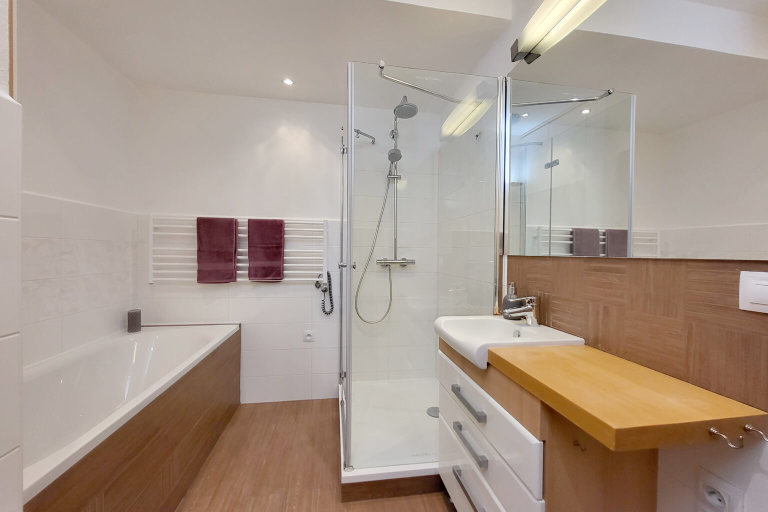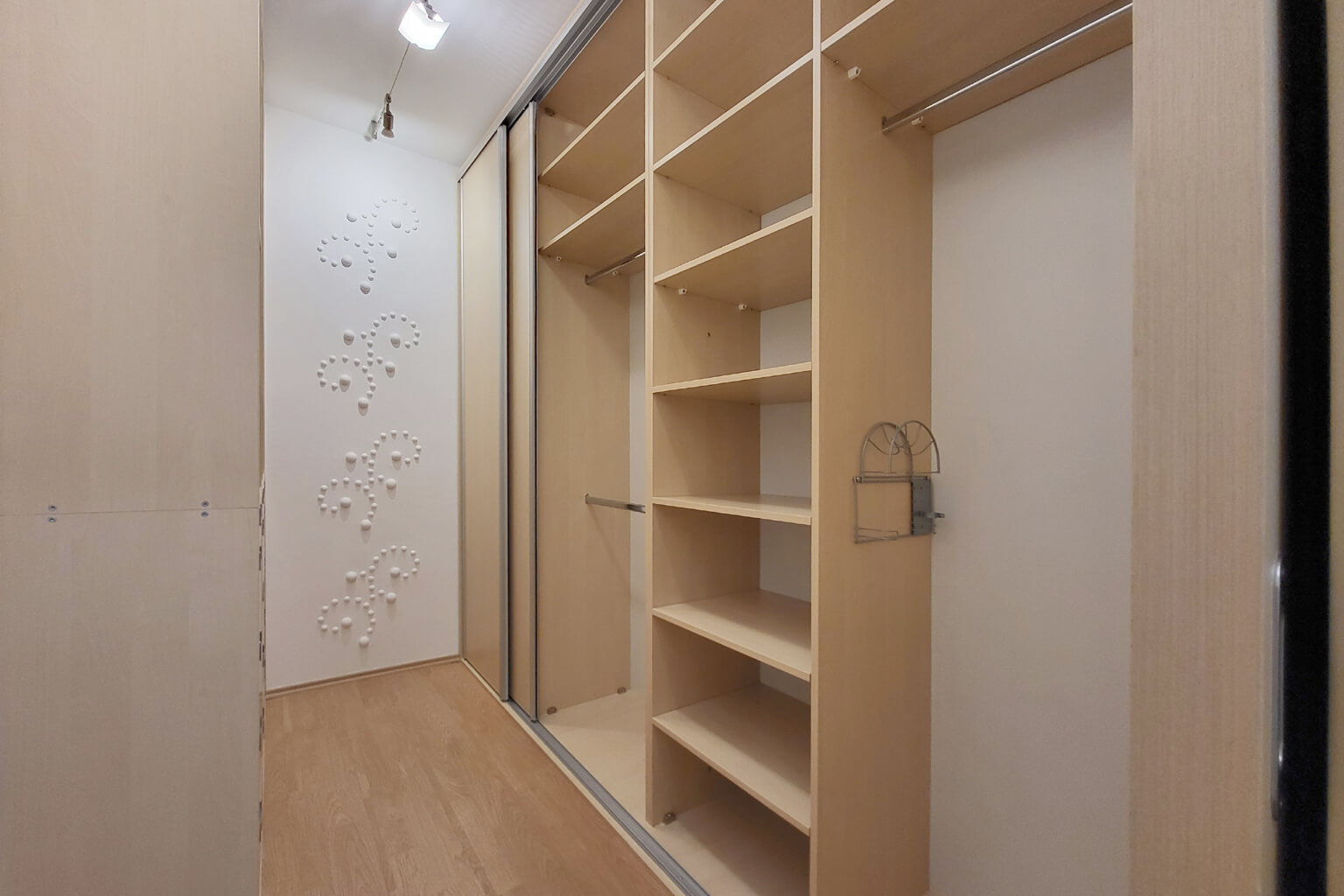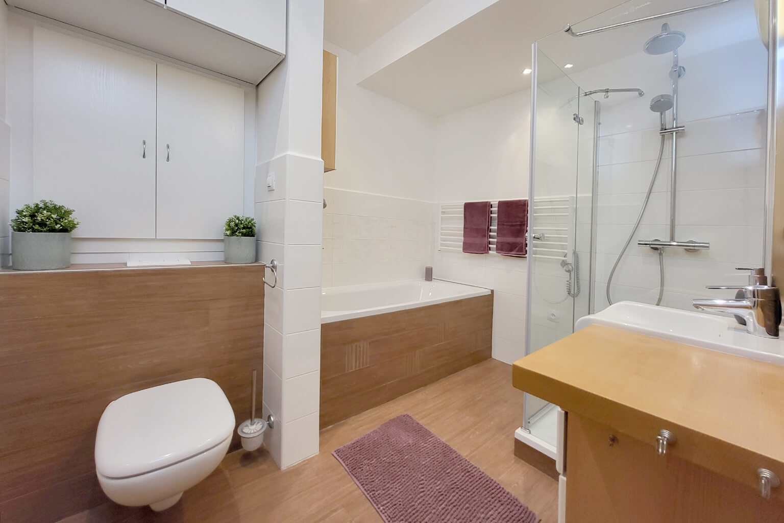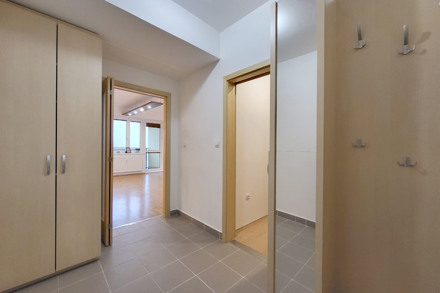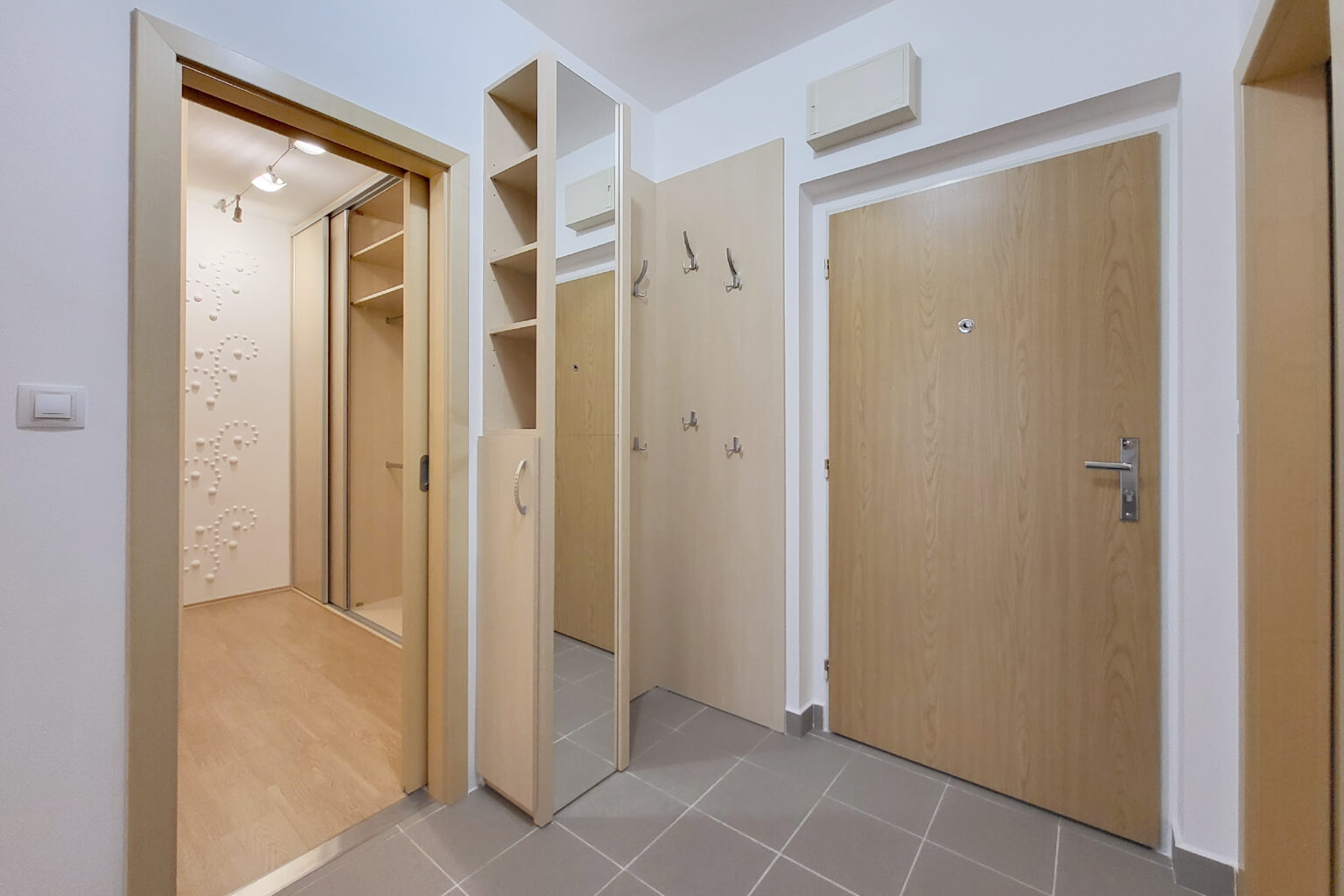 Při vstupu do bytové jednotky se ocitnete v předsíni 3,61m² ze které se dále dostanete do šatny 6,29m², která nabízí spousty úložného prostoru, dále chytře řešená koupelna 5,64m², s toaletou, vanou i sprchovým koutem .