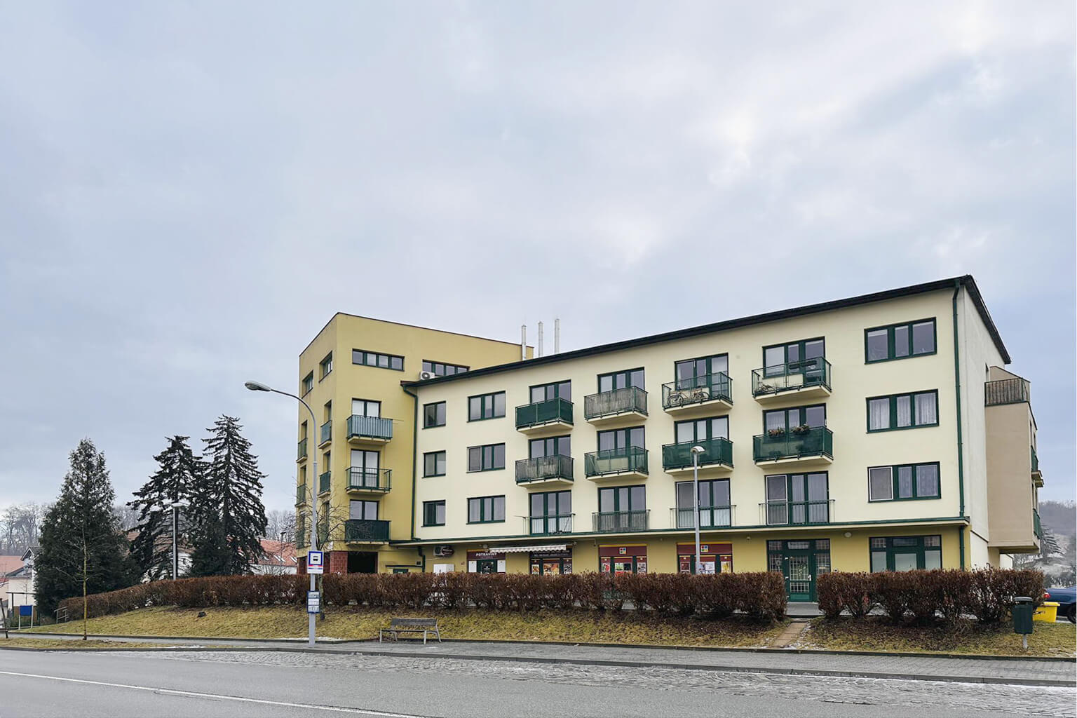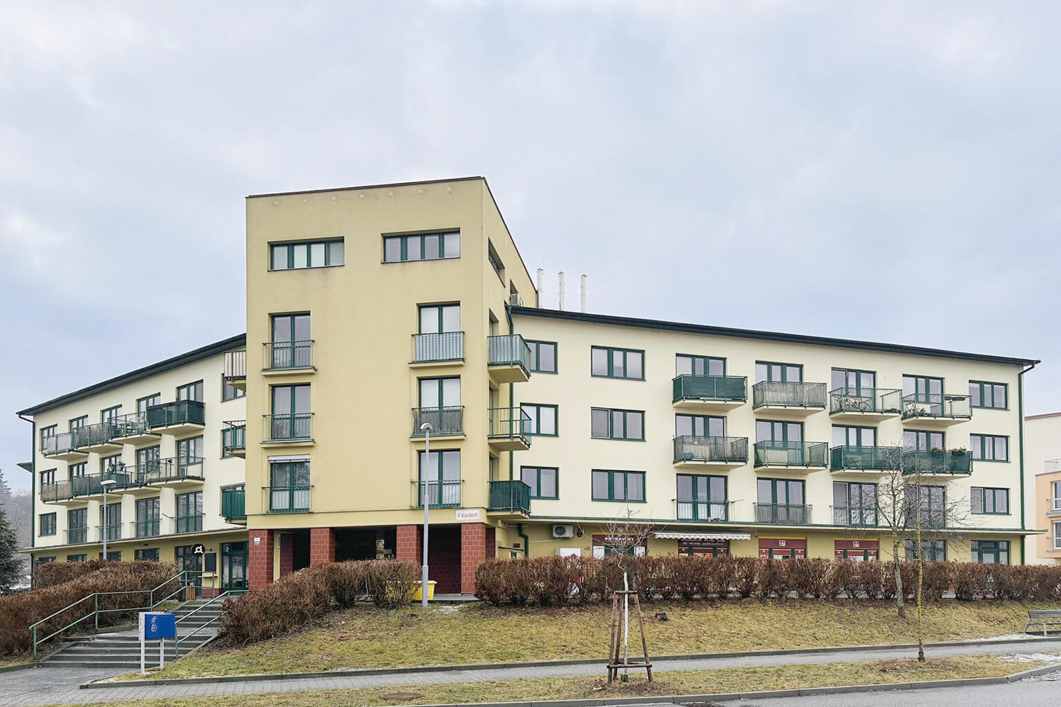 Bytová jednotka se nachází v 2NP cihlového domu. Do domu je bezbariérový přístup, k bytu i do garáží, kde se nachází parkovací stání, jezdí výtah.