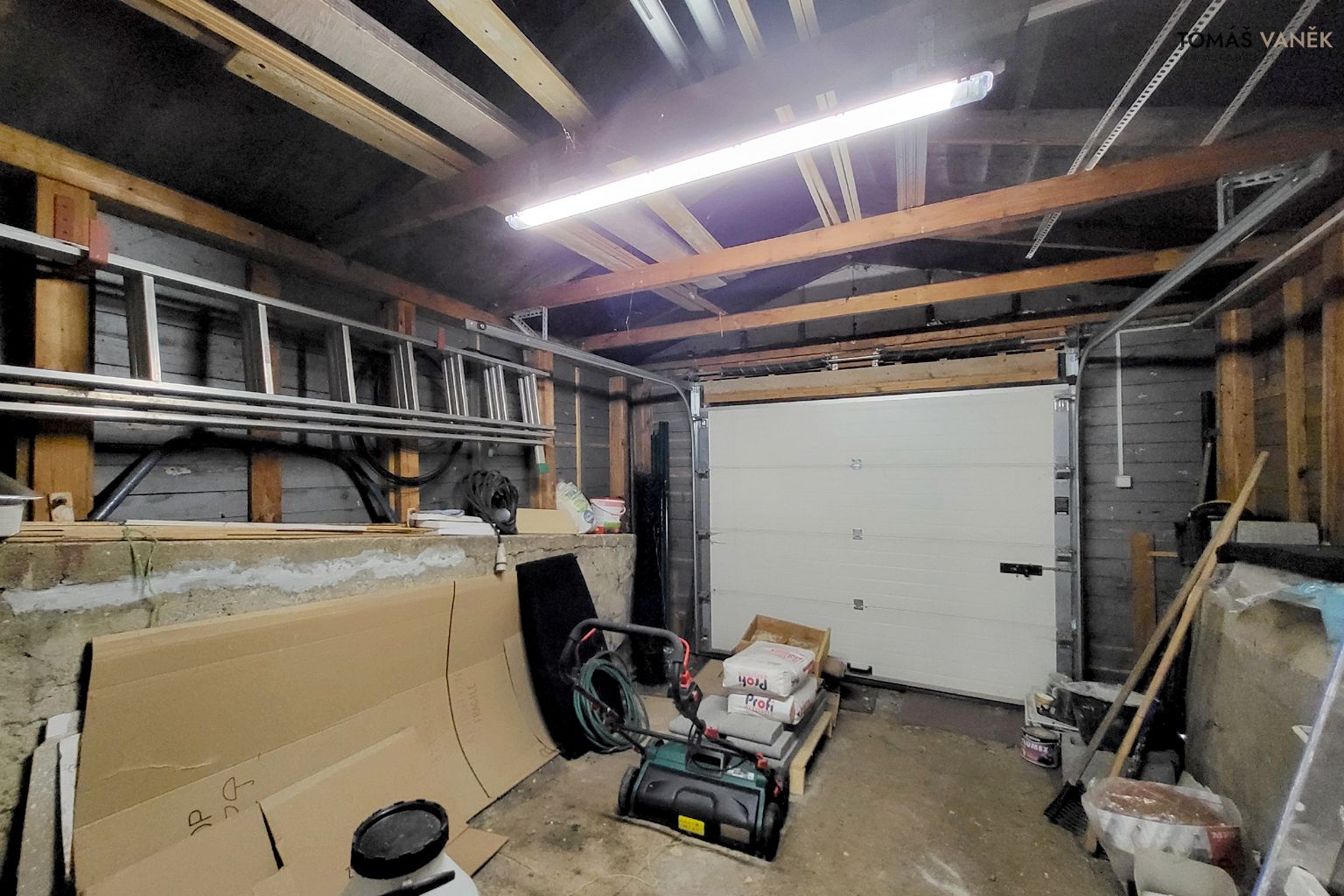Garáž je přistavěná k domu a napojena tak, že ze zahrady, přes sklep, se dostanete suchou nohou až do kuchyně. Ideální pro nákupy, kočárek nebo deštivé dny.